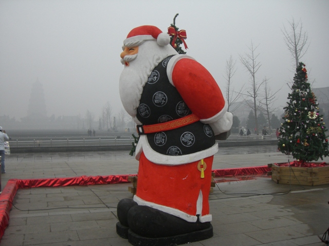 中国語でクリスマスは「聖誕節(sheng dan jie)と言います。 クリスマスイブは「平安夜(ping an ye)。 クリスマスの習慣は、最近になって中国に入ってきたそうです。 他の地方の様子はわかりませんが、西安では静かなものです。 お店の前にツリーが飾られていたり、ウィンドウなどにクリスマスの絵が貼ってあったりしますが、まだまだ一大行事ではない様子。 一応、中心部ではイベントがあったり花火が上がったりしているみたいですが・・・。 日本では、25日が終わると一夜にして年末の飾りつけに変わりますが、こちらはたぶん明日になってもクリスマスモードの飾りつけがまだたくさん残っているはずです。 去年は旧暦の中国のお正月近くまで、あちこちでサンタの姿を見かけました。 私の大学では、外国人教師は24日と25日にクリスマス休暇がもらえます。 日本人にとってクリスマス=休日とまではいきませんが、西洋人にとってはクリスマスは本当の意味で特別な日ですからねぇ。 でも、お休みだ~!と喜んでもいられません。 一年生の授業が遅れているので、昨日(24日)は通常通り授業をしました。 期末試験が目前なので、教師も必死なのです。。。 今日(25日)は一日お休みだったので、溜まっている仕事をして、それから街をお散歩。 「大雁塔」へ行ってみると・・・ 広場に大きなツリーとサンタが置いてありました。 さすがは中国サンタ!いかにも中華的なチャンチャンコを着ていらっしゃいます!!そしてちょっぴり腰が曲がり気味; ↓↓ 霞がかって見えにくいですが、遠くに映っている大雁塔とクリスマスツリーが何ともミスマッチです。 大雁塔は「玄奘三蔵法師」がインドから持ち帰った経典や仏像を保存するために建てられたものですが・・・ サンタの出現に、三蔵法師もさぞかし驚いていることでしょう。。。 陝西歴史博物館も回りましたが、クリスマスモードではなく、いつもと変わらない様子でした。
